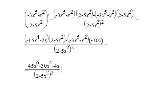 y'=1/(2-5x^2)^2*(-15x^4-2x)(2-5x^2)-(-3x^5-x^2)(-10x)=1/(2-5x^2)^2*(-30x^4-4x+10x^3+75x^6-30x^6-10x^3)=