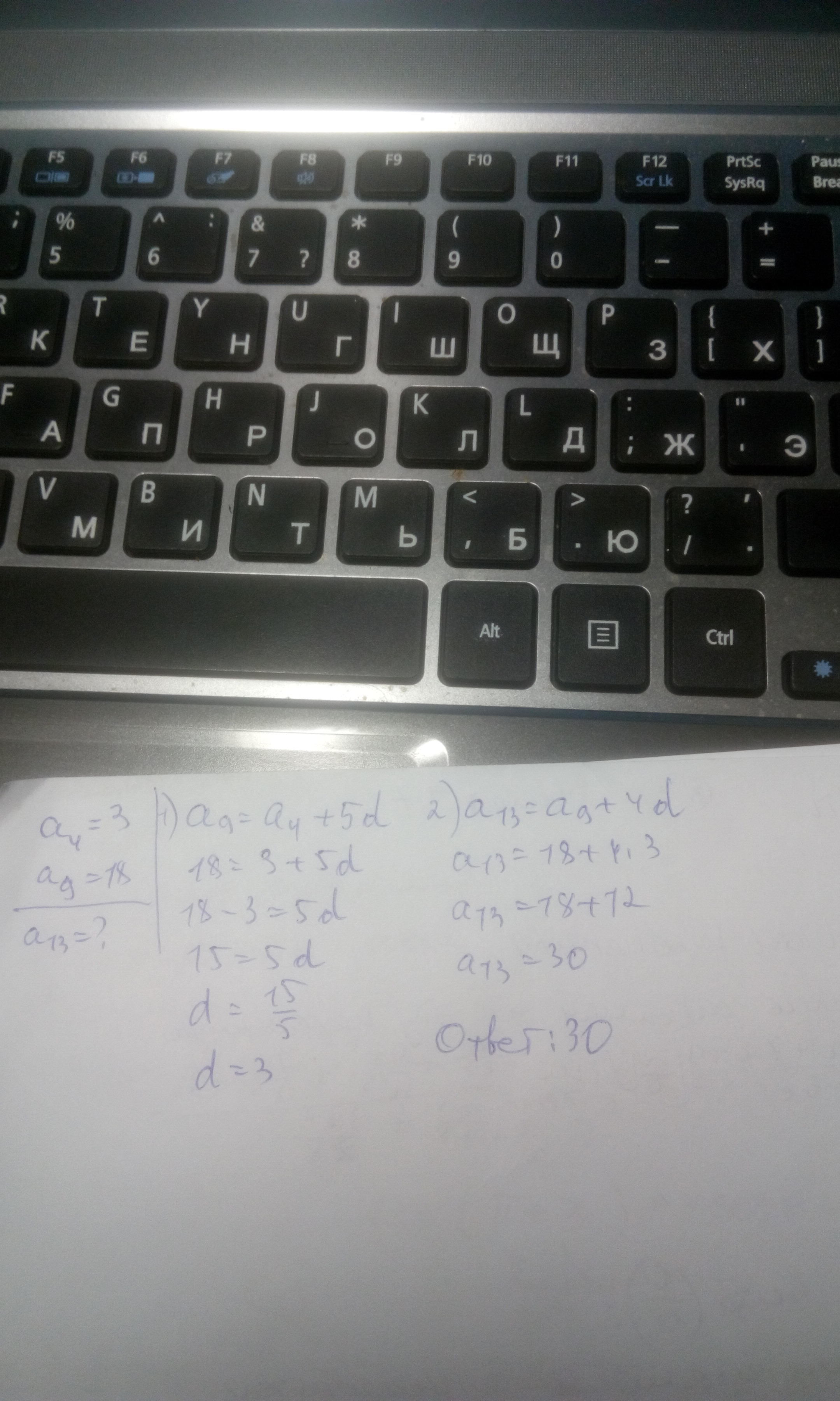 четвертий член арифметичної прогресії дорівнює 3 , а дев'ятий дорівнює 18. Знайдіть тринадцятий член арифметичної прогресії.
