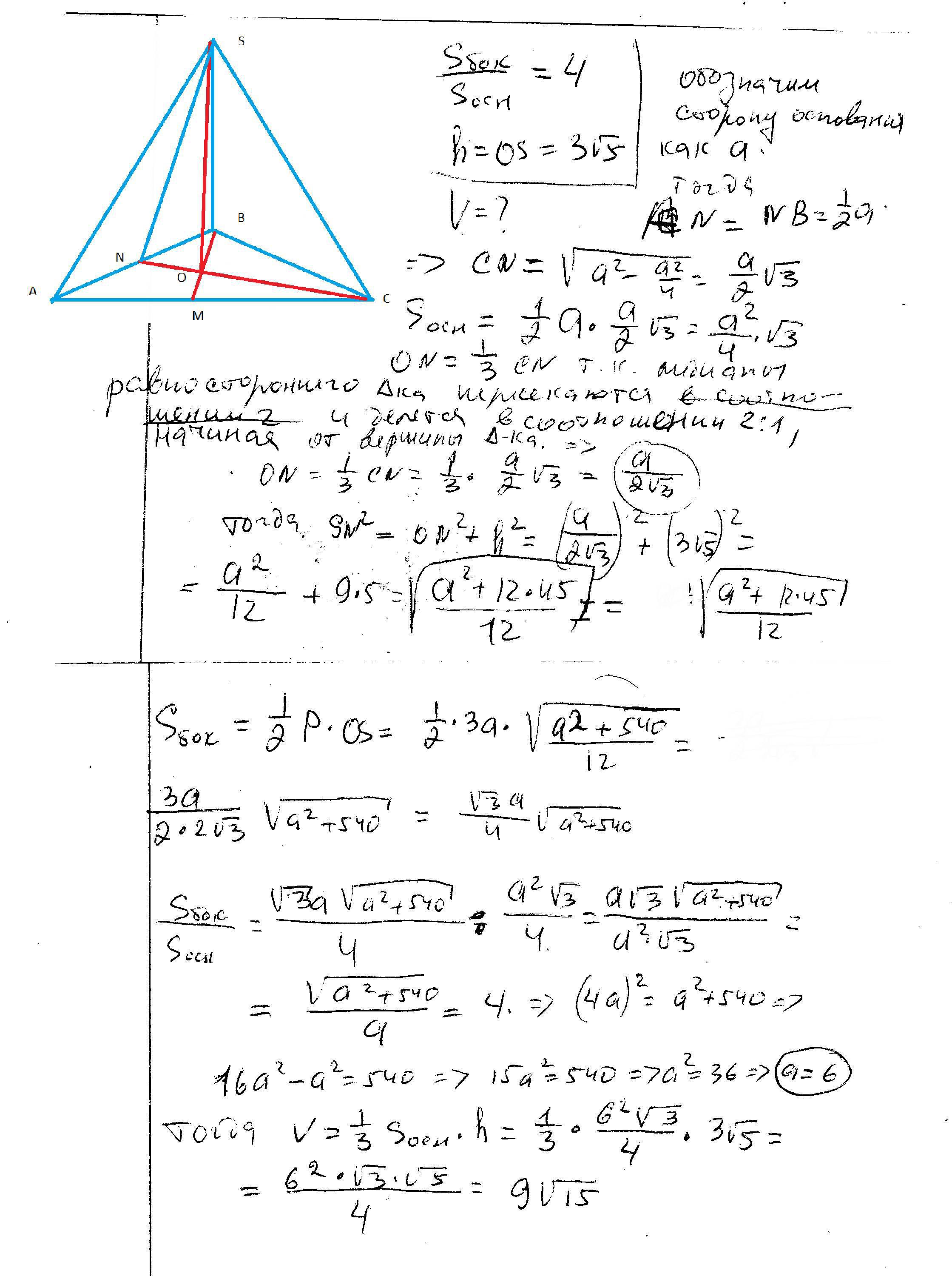Высота правильной треугольной пирамиды 3корня из 5. Если площадь боковой поверхности в 4 раза больше площади основания, то объём пирамиды равен???(решение+рисунок)