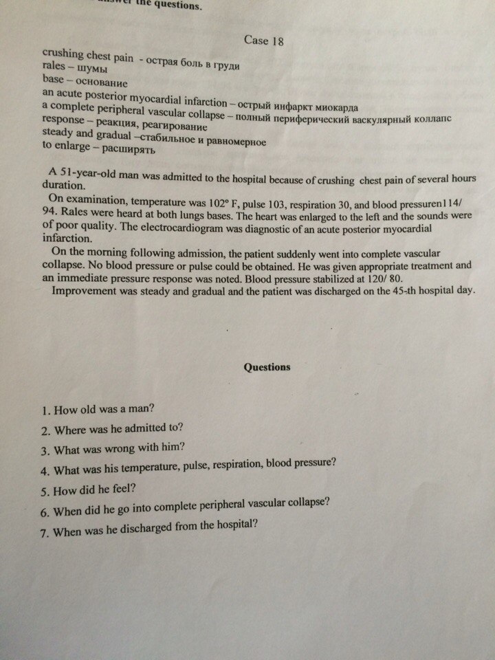 51-летний мужчина был госпитализирован из-за сокрушительной боли в груди на протяжении нескольких часов.При осмотре температура составляла 102 градуса Фаренгейта, пульс 103, дыхание 30, и кровяное давление 114/94. Хрипы были слышны в обоих легких. Сердце плохо работает. Электрокардиограмма диагностировала острый инфаркт миокарда.На следующее утро после приема, у больного неожиданно свернулись сосуды(?). Нельзя было померить ни кровяное давление,ни пульс. Ему дали соответствующее лечение и