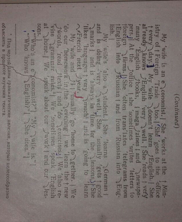 Моя жена — экономист. Она тоже работает в министерстве внешней торговли. Она ходит в офис каждый день. Моя жена не учит английский язык. Она уже очень хорошо знает английский. Она читает очень много английских книг, журналов и газет. В офисе она иногда пишет письма для иностранных фирм. Она часто переводит телеграммы с английского на русский и с русского на английский язык. Моя жена также студентка.Она учит немецкий и делает очень хорошо. Она обычно получает хорошие оценки и всегда вовремя делает уроки. Она очень любит языки и собирается изучать французский язык в следующем году. Моя жена и я обычно идем домой вместе. Мы делаем наше домашнее задание вечером: мы учим новые слова, читаем тексты и деланм упражнения. Мы также пересматриваем правила по грамматики. Иногда мы говорим на Английский дома. Мы говорим о нашей работе и наших уроках.