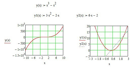 Определим первую производную функции y1(x)=3*x²-2*x. Далее находим, при каких х функция равна нулю. Решаем квадратное уравнение. x1=0, x2=0.667. В точке х1 производная меняет знак с + на -, это точка локального максимума. В точке х2 производная меняет знак с - на +, это точка локального минимума. Определим 2 производную y2(x)=6*x-2. y2 равна нулю при х=0,333. То есть левее точки 0,333 исходная функция имеет выпуклость вверх (y2 отрицательна ), а правее выпуклость вниз (y2 положительна). Графики приложены в рисунке.