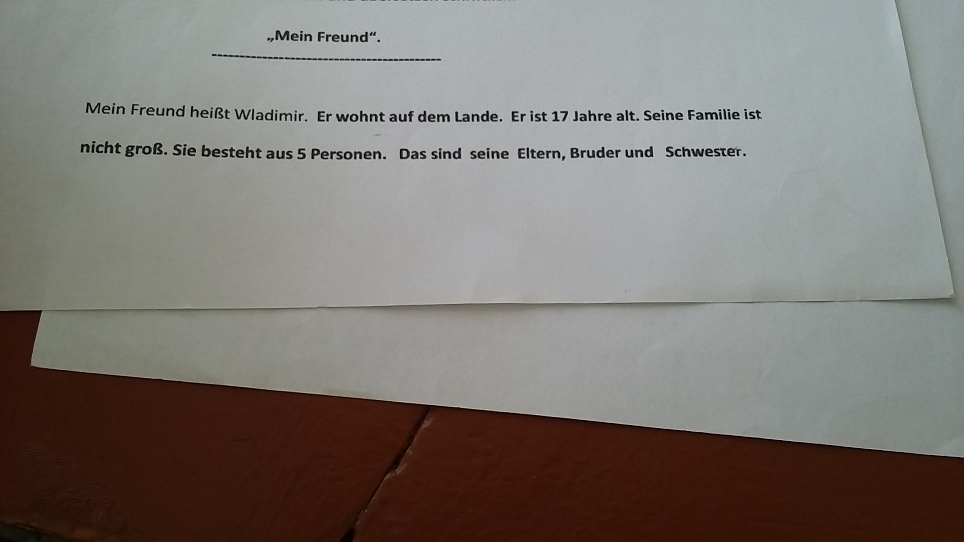 Моего друга зовут Владимир. Он живёт за городом. Ему 17 лет. Его семья- не большая. Она состоит из 5 человек. Это его родители, брат и сестра.