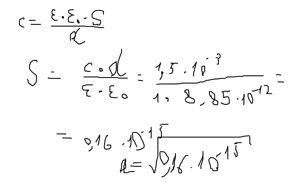 Плоский воздушный конденсатор образован двумя квадратными пластинами,отстоящими друг от друга на расстоянии 10^-3 м. Какой должна быть длина каждой из этих пластин,чтобы ёмкость конденсатора равнялась 1,5 Ф?