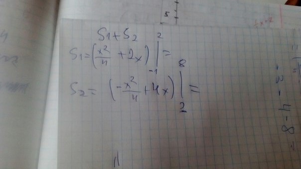 S1 = |2^2/4 - 2*2 - (-1)^2/4 + 2*(-1)| = |1 - 4 - 1/4 - 2| = |- 5 1/4| = 5,25