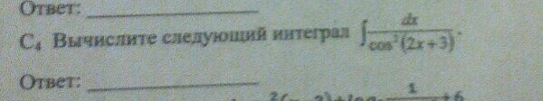На листе не могу. Попробую описать словами. После замены переменной получим: одна вторая, интеграл от du/cos в квадрате (u); равно одна вторая на tg(u) плюс С; далее равно дробь в числителе tg(2x+3), в знаменателе 2 и далее плюс С.