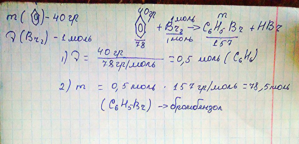 К 40 г бензола в присутствии катализатора добавили 1 моль брома. Какие вещества и сколько граммов их получилось после реакции?