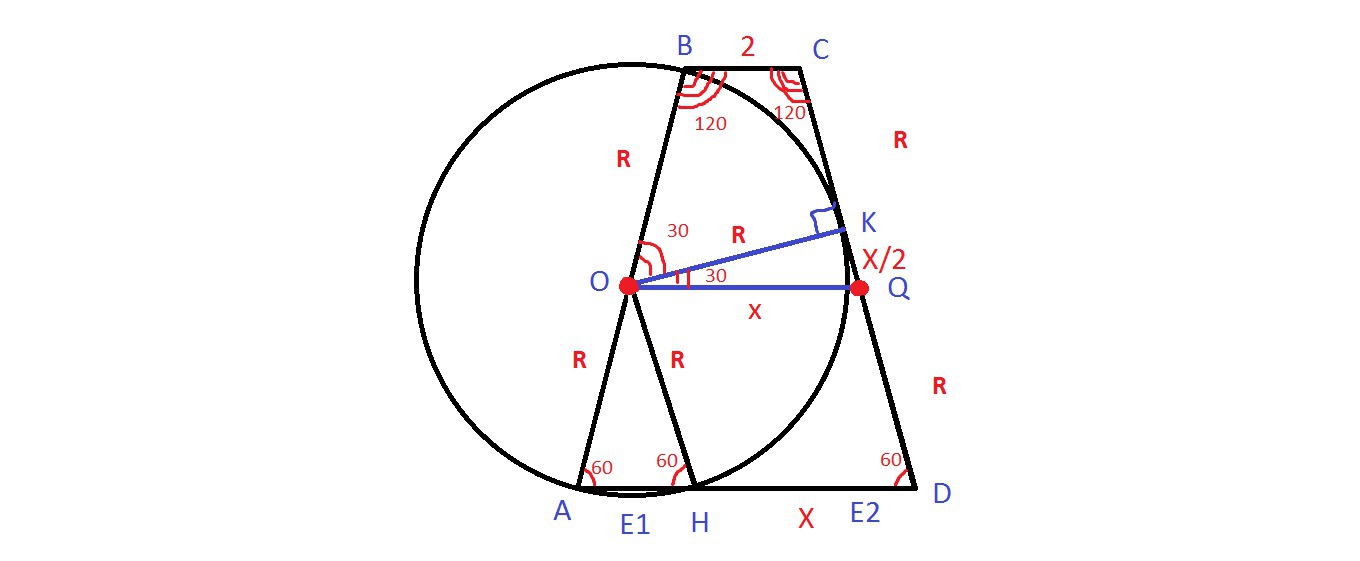 Пусть окружность касается стороны CD в точке К, ОЕ1 и ОЕ2 - высоты трапеции АОQD