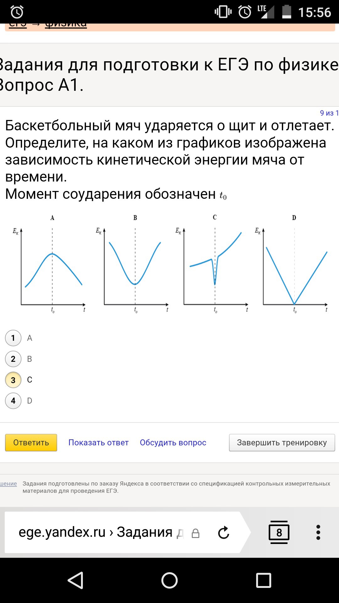 Баскетбольный мяч ударяется о щит и отлетает. Определите, на каком из графиков изображена зависимость кинетической энергии мяча от времени.