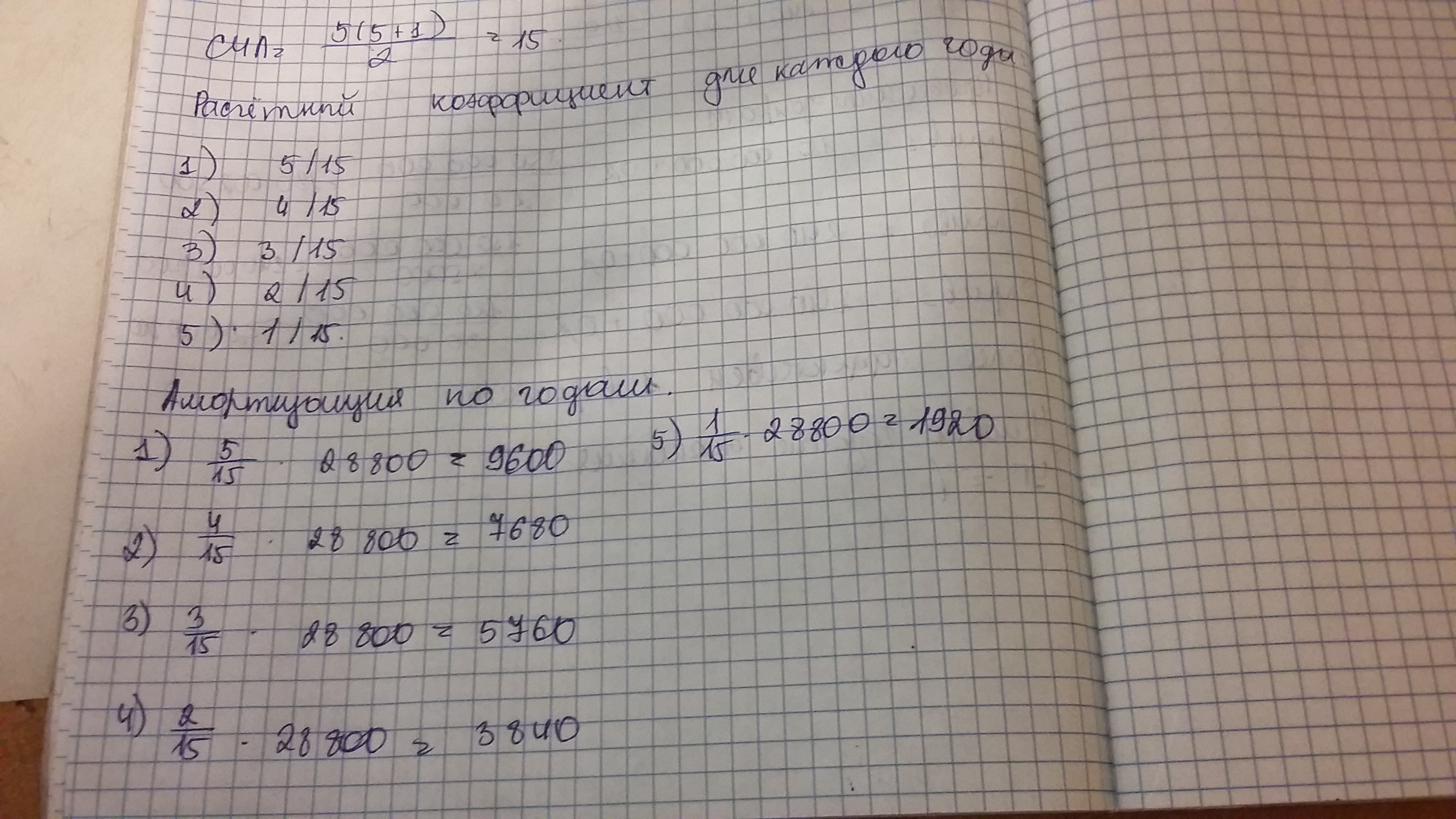Первоночальная стоимость объекта основных средств используемого в основном производстве -28800р . Стоимость полезного использования- 5 лет . Объект амотизируется способом списания по сумме чисел лет срока полезного использования. Распределите сумму амотизированных отчислений за год и месяц . Составьте бухгалтерские проводки. Помогите пожалуйста...
