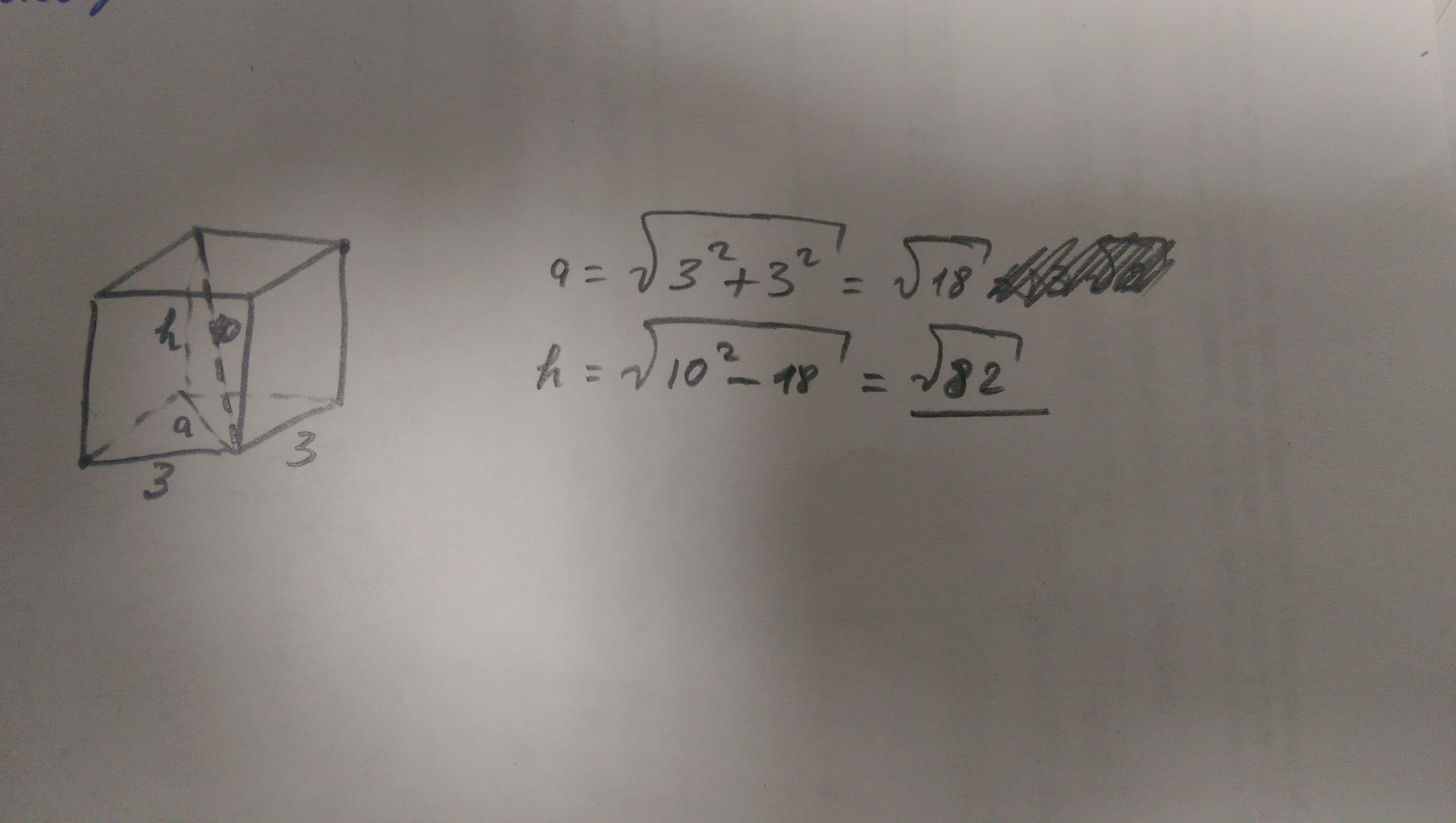 Найти высоту правильной четырёхугольной призмы, если сторона её основания равна 3 см, а диагональ 10 см.