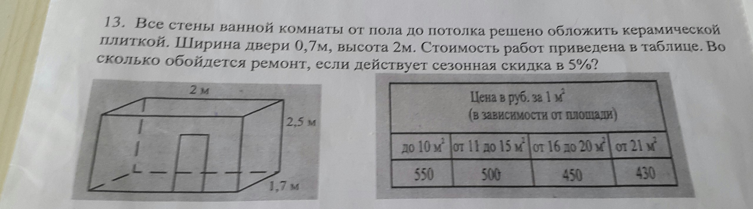 18,5 м² - (0,7*2) м²= 18,5 м² - 1,4 м² = 17,1 м² - требуется обложить плиткой, что составляет по таблице промежуток от 16 до 20 м², т.е. стоимость работ за 1 м² будет (без скидки):