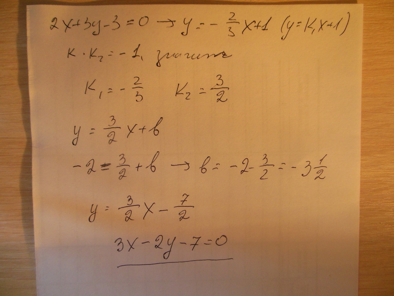Найти уравнение прямой, которая проходит через точку М0(1; -2) перпендикулярно прямой 2x+3y-3=0.