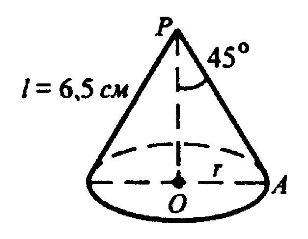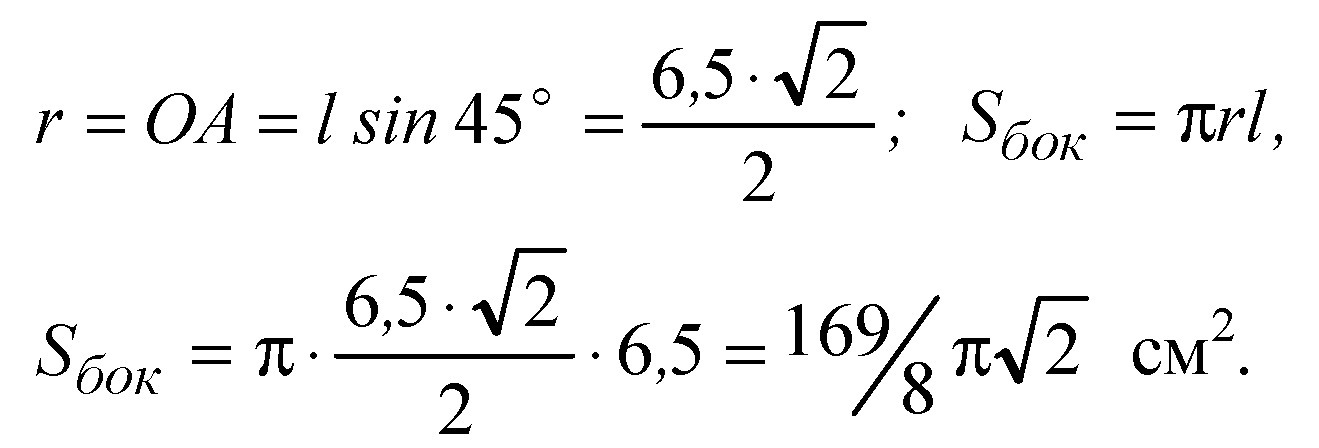Угол между образующей и осью конуса равен 45 градусам, образующая равна 6,5 см. Найти площадь боковой поверхности.