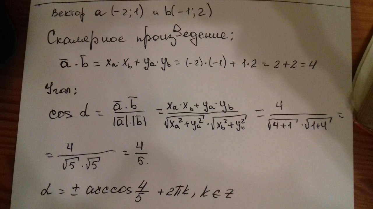 Найдите скалярное произведение векторов a(−2, 1), b(−1, 2) , заданных в декартовой системе координат, и угол между ними