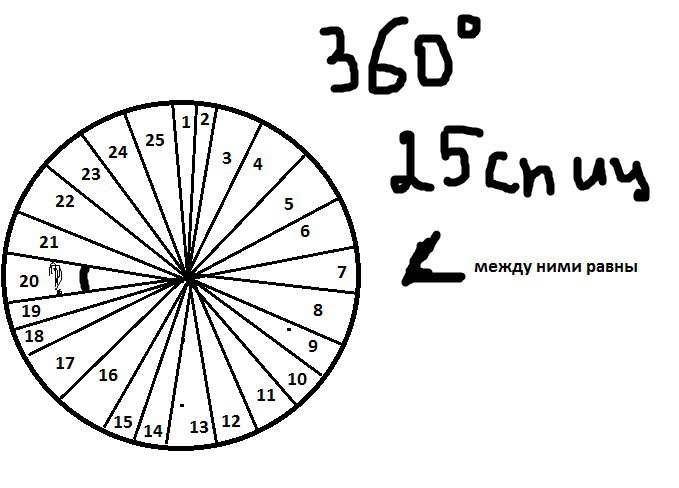 Колесо имеет 25 спиц. Углы между соседними спицами равны. Найдите угол который образует 2 соседние спицы. Ответ дайте в градусах. (Как решать?)