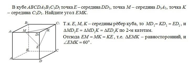 в кубе абсда1б1с1д1 точка Е середина ДД1 точка М середина Д1А1 точка К середина C1Д1. Найдите угол ЕМК