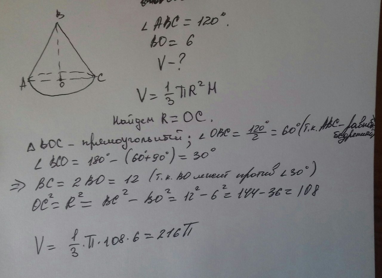 Осевым сечением конуса является равнобедренный треугольник с углом 120 градусов.Найдите объем конуса,если его высота равно 6.РЕБЯТ СРОЧНО!!! Буду очень благодарна!!