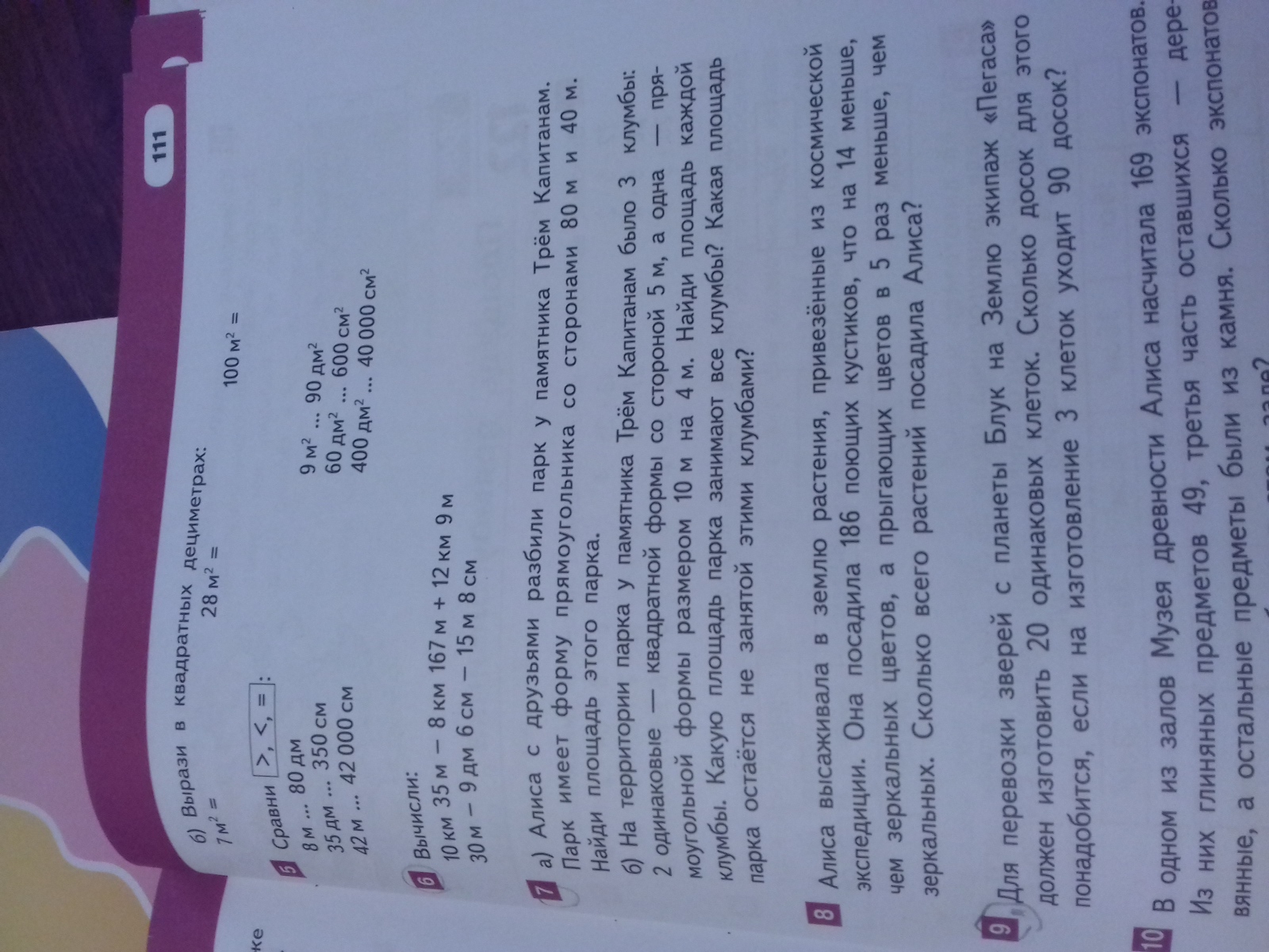начнем с 6 задания. 1) 10км 35м - 8км 167м + 12км 9м1км = 1000мт.к. сестра вряд ли еще знает десятичные дроби, переведем километры в метры.10*1000 + 35м - 8*1000 + 167м + 12*1000 + 9м = 10000 + 35 - 8000 + 167 + 12000 + 9 = 14211м. 14211м = 14км 211м2) 30м - 9дм 6см - 15м 8 см в 1м 10дмв 1м 100 смвсе переведем в сантиметры30*100 - 9*10 + 6 - 15*100 + 8 = 3000 - 90 + 6 - 1500 + 8 = 1424см = 14м 24см = 14м 2дм 4см