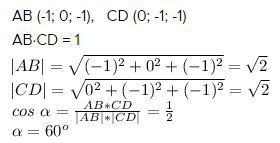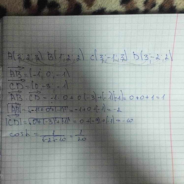 Задание такое: Вычислите угол между векторами АВ и СД, если известны координаты А(2;2;3) В(1;2;2) С(3;-1;3) Д(3;-2;2)