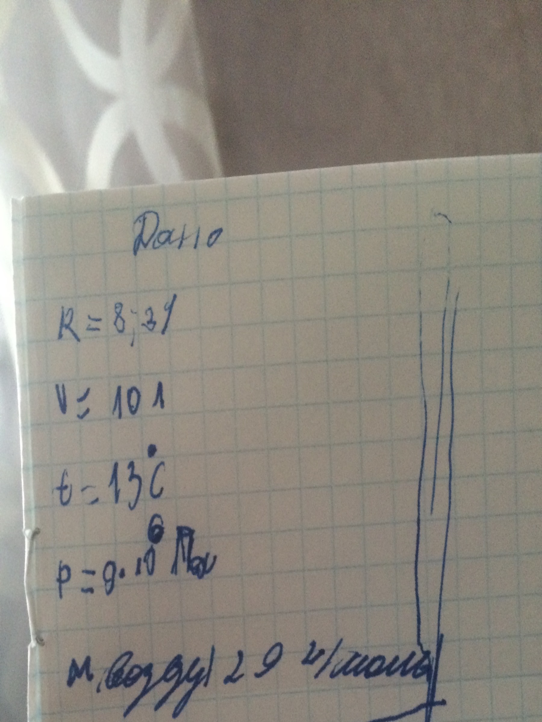 m=P*V*M/R*T=9*10^6*10^-2*29*10^-3/8,31*286=1,1 кг