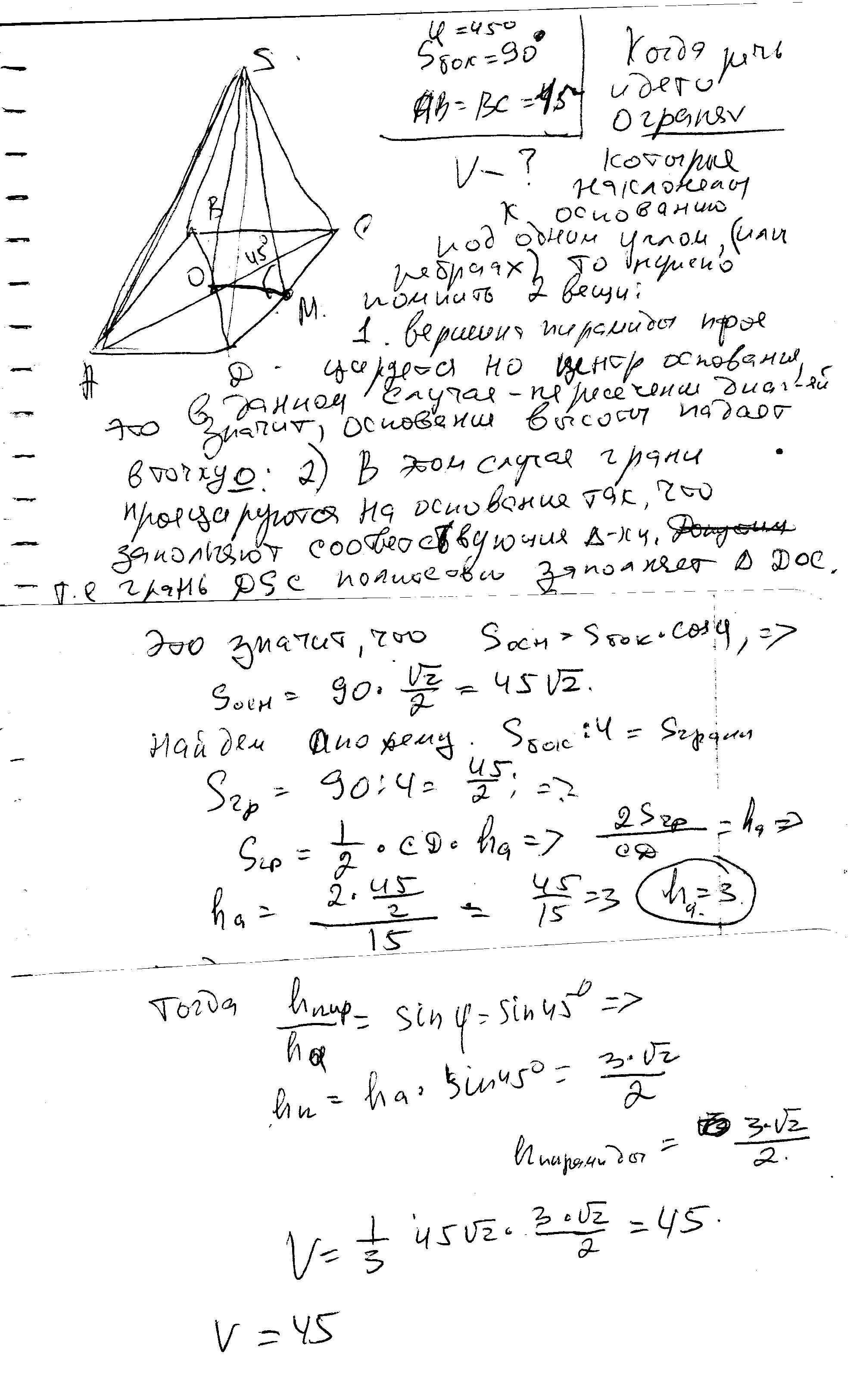 H=l·sin45=3/√2, Вышеназванный отрезок - это половина высоты ромба в основании, равный высоте пирамиды, так как тр-ник равнобедренный.