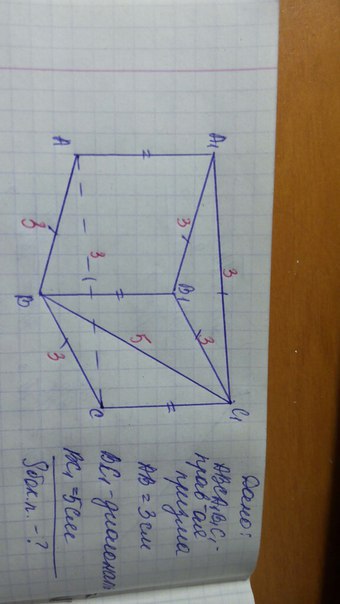Так як правильна призма, отже, AA1=BB1=СС1, {AA1;BB1;СС1}, перпендикулярній площині підстави (АВС) і трикутники ABC і A1B1C1-рівні рівносторонні трикутники. Розглянемо трикутник B1BC1: він прямокутний (кут В1=90 градусів) по теоремі Піфагора: BB1^2=BC1^2-B1C1^2=25-9=16, BB1=4 див. Ѕбок.=3SAA1BB1. SAA1BB1=AA1*AB=4*3=12 см^2. Ѕбок.=3*12=36 см^2.