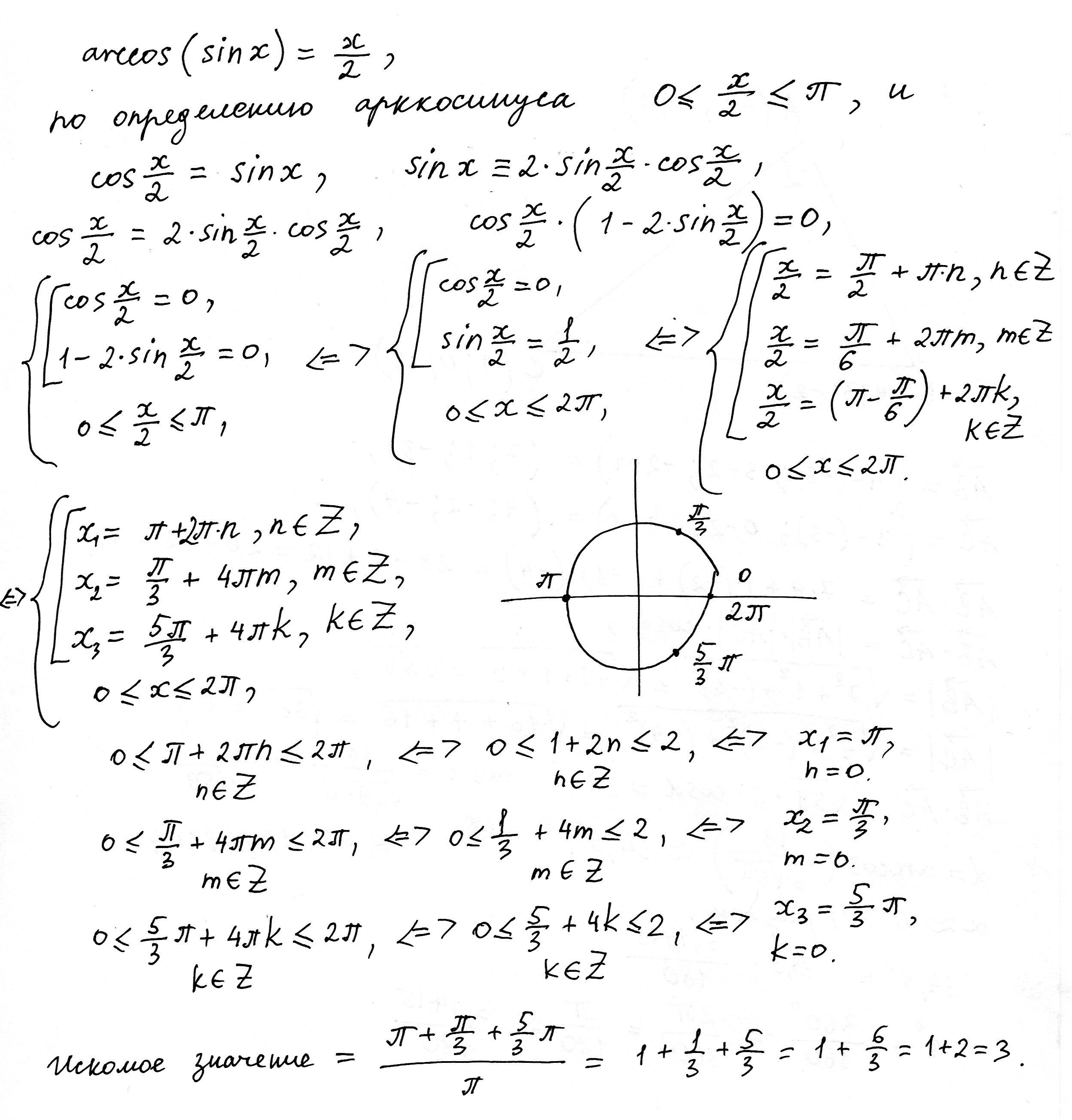 Решить уравнение arccos(sinx)=x/2. В ответ записать значения S/pi, где S - сумма всех корней уравнения.