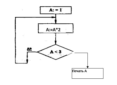 3. Фрагмент алгоритма изображен в виде блок-схемы. Определите, какое значение переменной А будет напечатано в результате выполнения алгоритма.