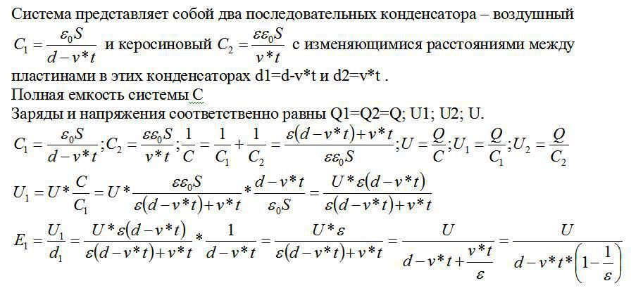 расстояниями между пластинами в этих конденсаторах d1=d-v*t и d2=v*t . Полная емкость системы С. Заряды и напряжения соответственно равны Q1=Q2=Q; U1; U2; U