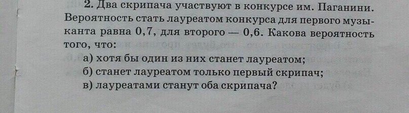 Пусть p1=0.7, p2=0.6 - вероятности стать лауреатами для первого и второго музыкантов. Вероятности не стать ими равны 1-p1 и 1-p2 соответственно.