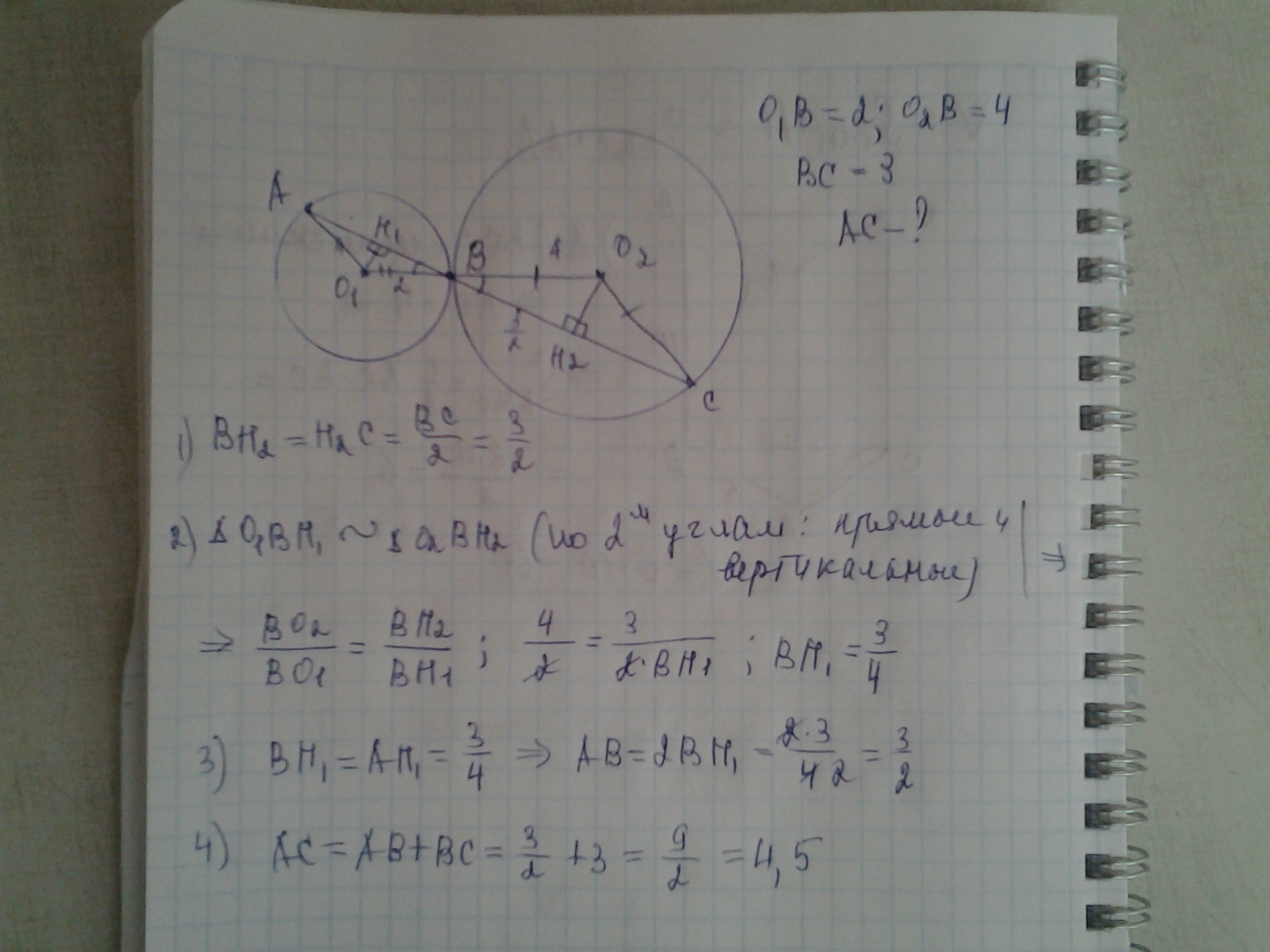 Окружности радиусов 2 и 4 касаются в точке В. Через точку В проведена прямая, пересекающая второй раз меньшую окружность в точке А, а большую – в точке С. Известно, что ВС = 3. Найдите АС