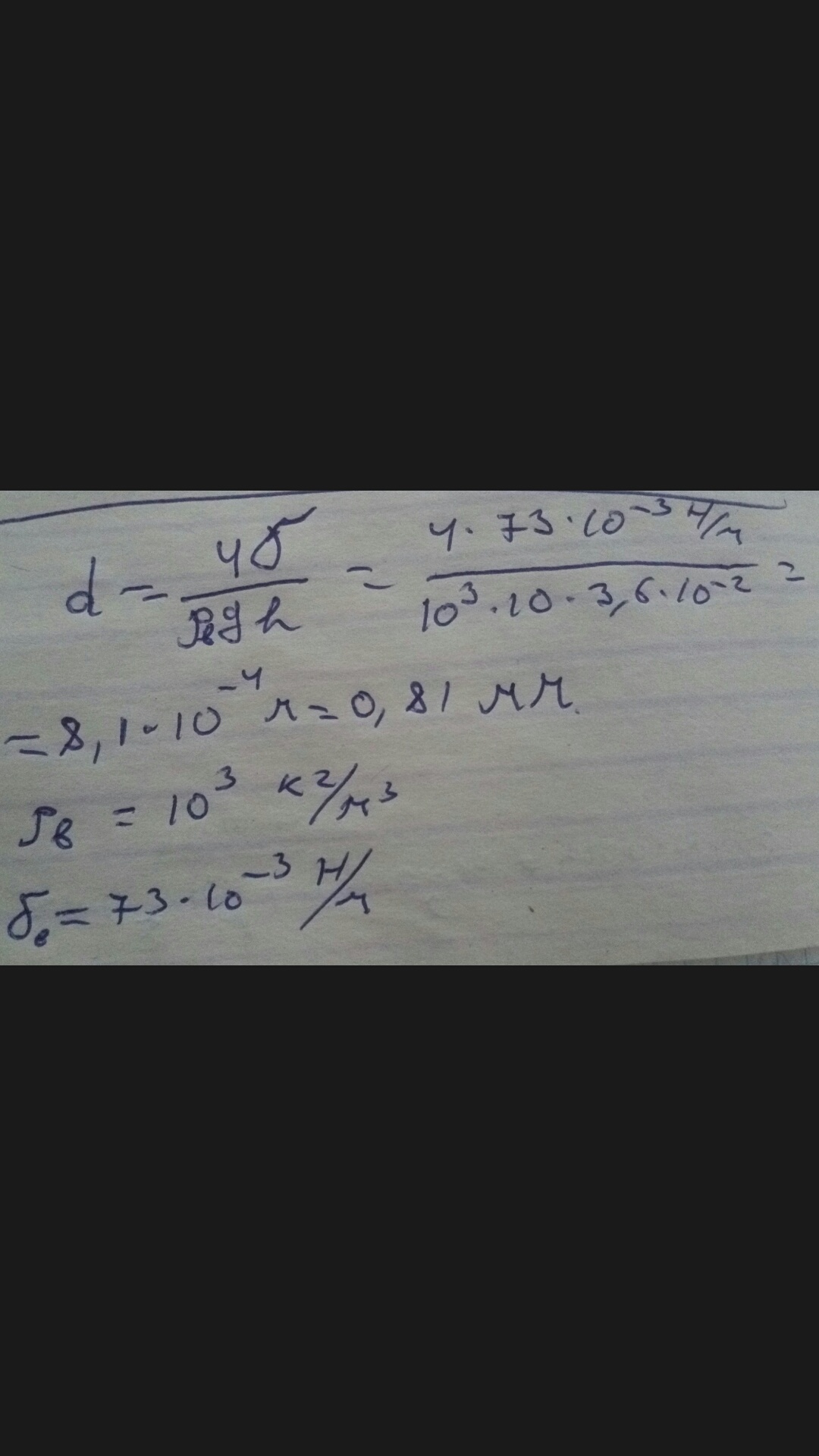плотность воды p = 10^3 кг/м^3, коэф-т поверхностного натяжения воды при 20 °С σ = 72,25*10^-3 Н/м