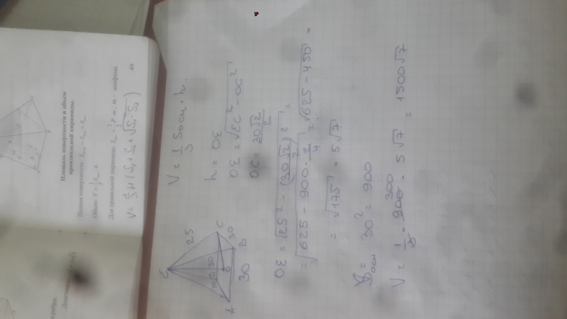 В правильной четырехугольной пирамиде апофема равна 25 см, а сторона основания - 30 см. Найдите площадь, объем пирамиды.