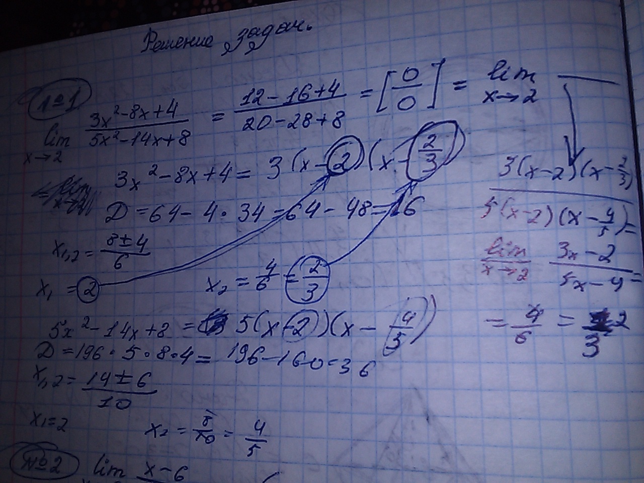 Lim (x->2) 3х^2-8х+4 / 5х^2-14х+8 (С решением)