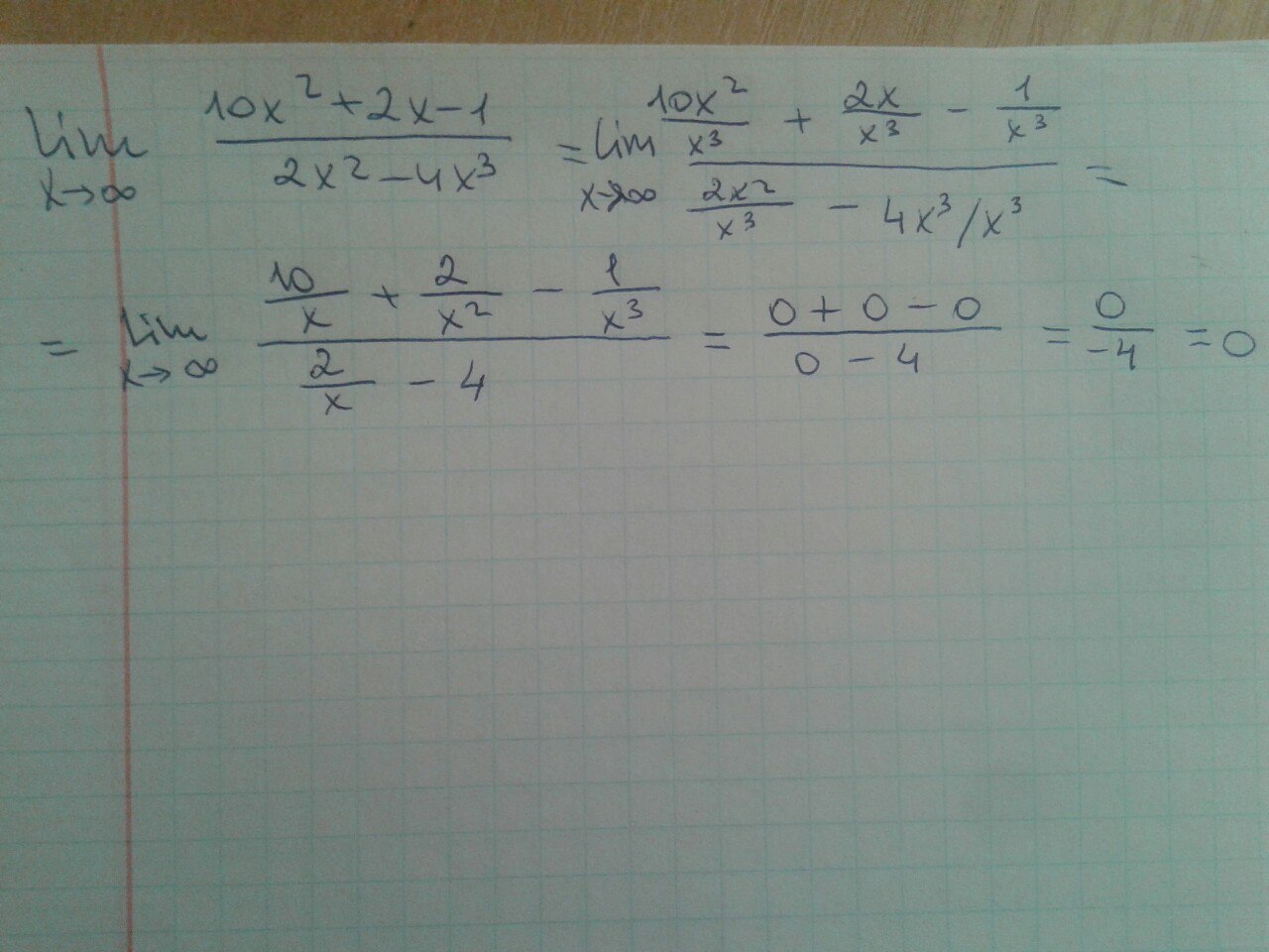 Делим на старшую степень, после подставляем значение, к которому стремится переменная х, получаем дробь: бесконечно малое число(0)/ненулевую константу(-4). Предел равен 0.