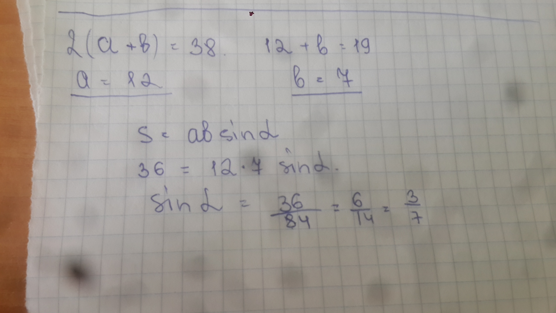 Периметр параллелограмма равен 38,площадь 36,а одна из сторон 12. Найдите синус острого угла параллелограмма.