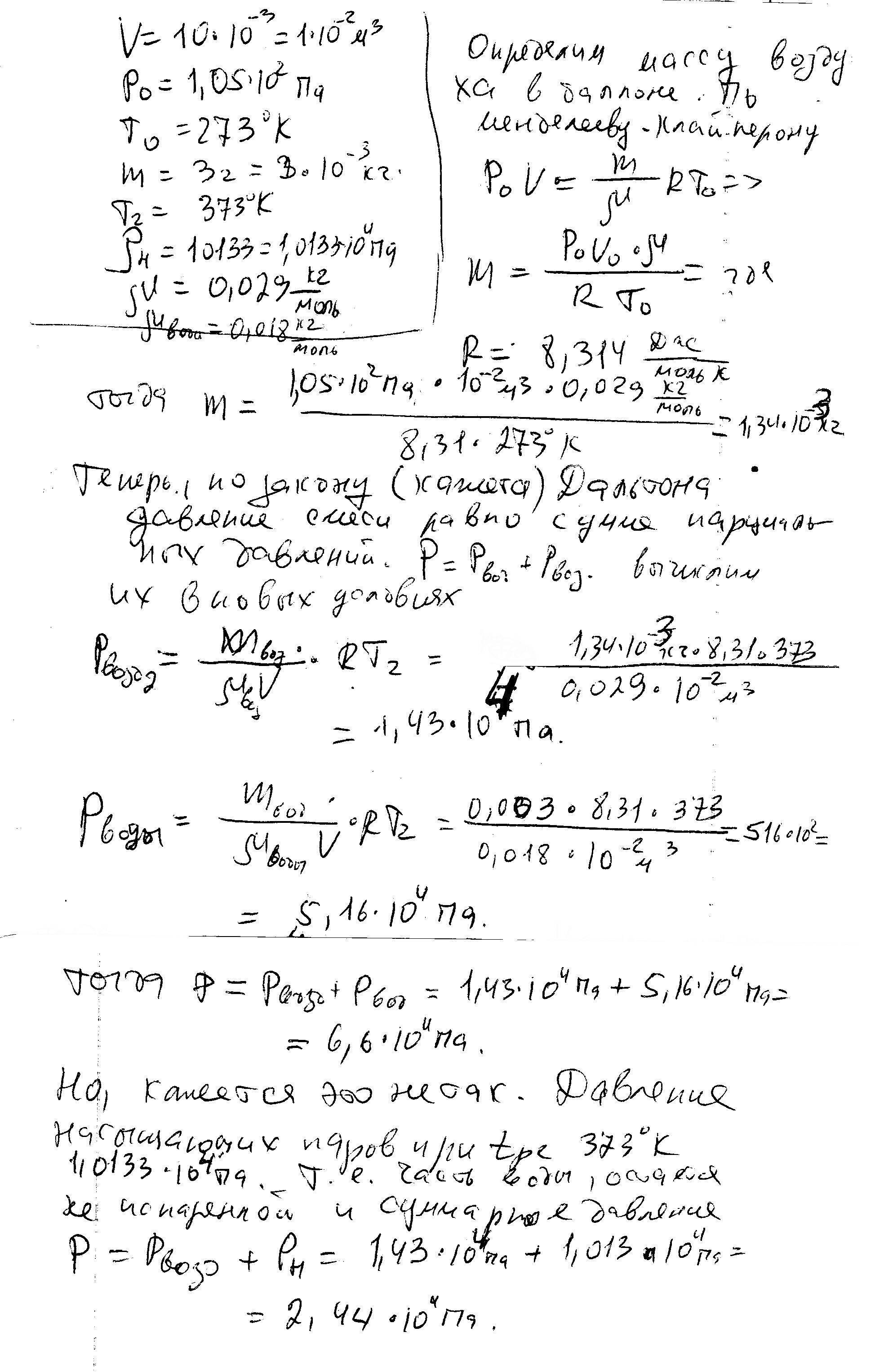 В сосуд объёмом V = 10 дм3, наполненный сухим воздухом при давлении ро = 105 Па и температуре То = 273 К, вводят m = 3 г воды. Сосуд нагревают до температуры Т = 373 К. Каково давление влажного воздуха в сосуде при этой температуре? Молярная масса воздуха М = 0,029 кг/моль, давление насыщенного пара пара при температуре Т = 373 К р = 10133 Па.