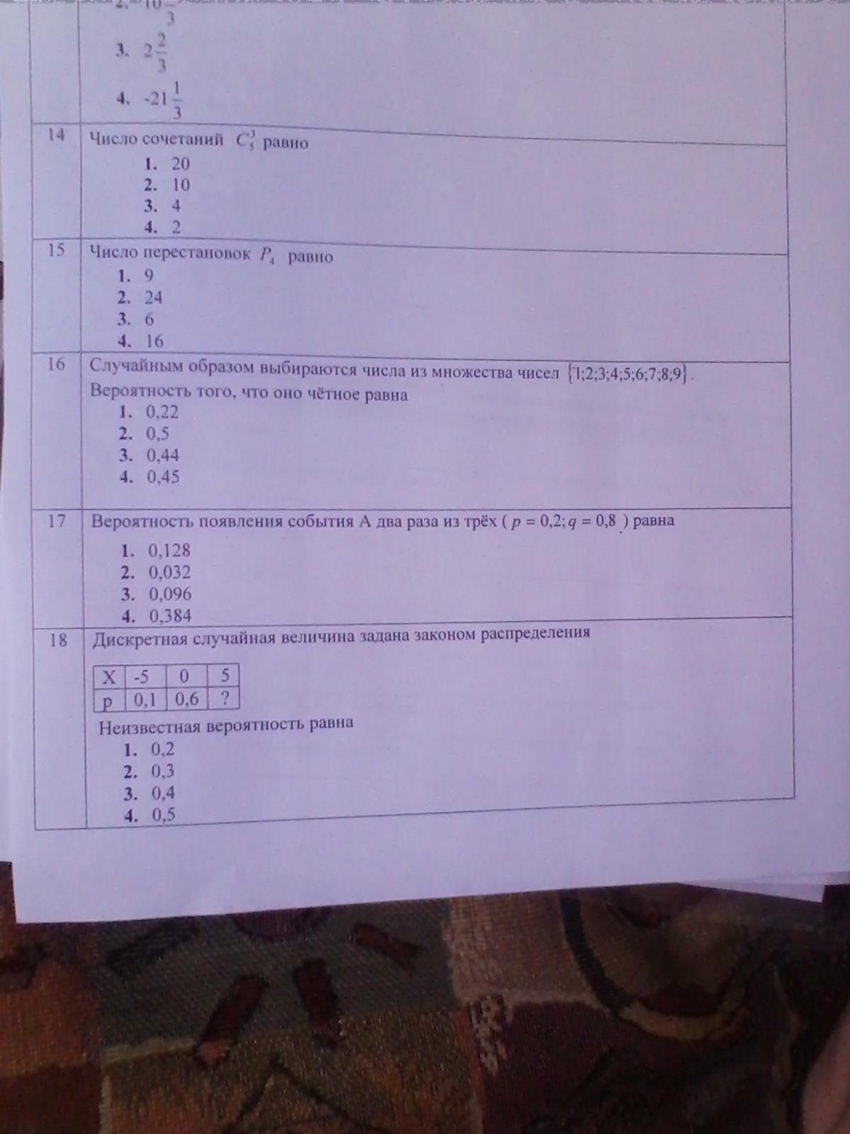 17) C(3,2)*0.2^2*0.8^1 = 0.096