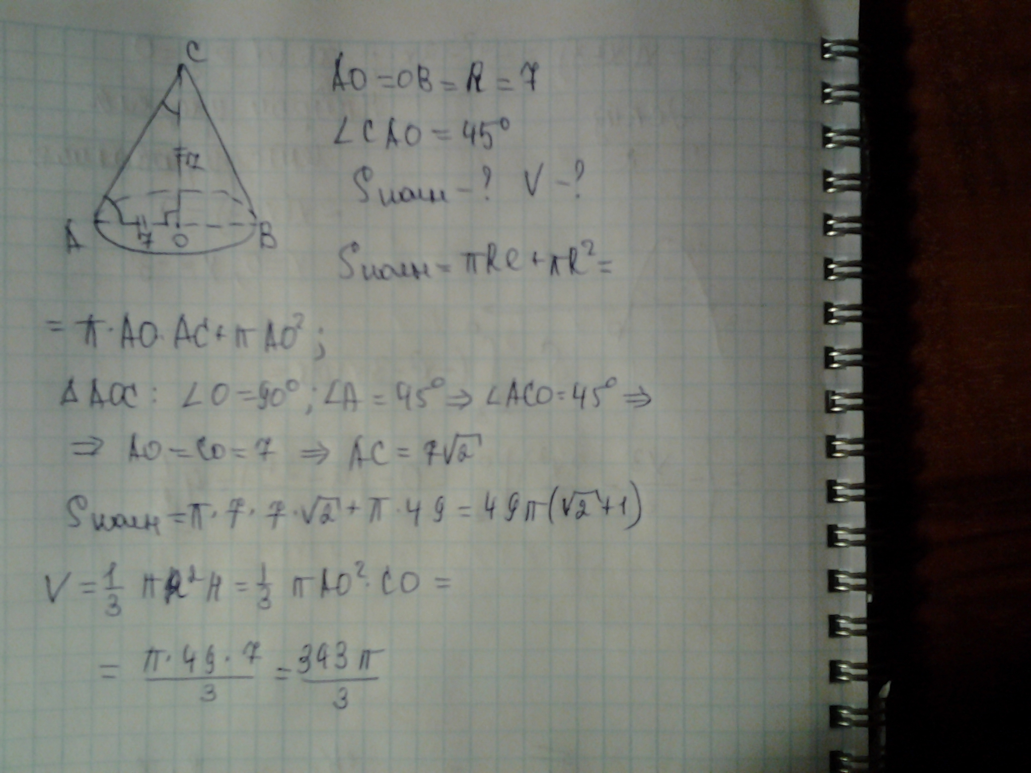 Радиус основания конуса равен 7 см, а образующая наклонена к плоскости основания под углом 45 градусов. Найдите площадь полной поверхности и объем конуса.