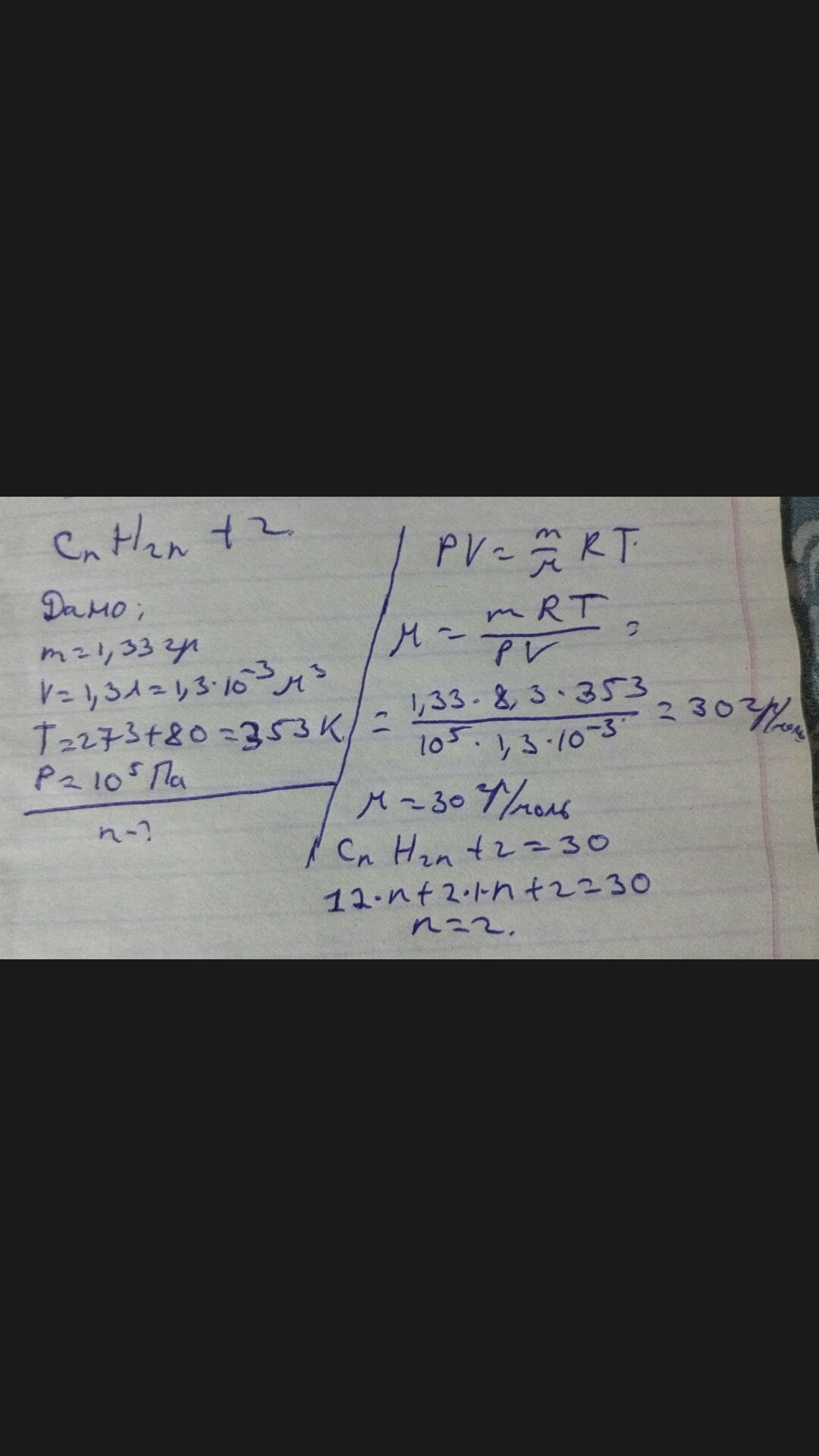 Газообразный углеводород CnH2n+2 в количестве 1,33 г находится в сосуде объемом 1,3л при температуре 80 градусов и давлении 10^5 Па.Если учесть что молярная масса углерода и водорода соответственно 12 г/моль и 2 г/моль.То чему равно n ?