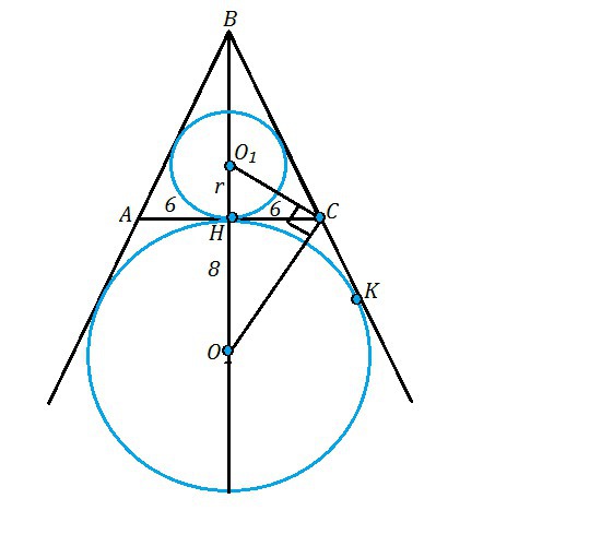 Центр вписанной в угол окружности лежит на его биссектрисе. Окружность радиуса 8 - вневписанная, касается сторон двух углов - А и С, ее центр лежит на пересечении биссектрис этих углов, смежных с углами А и С ∆ АВС соответственно,⇒