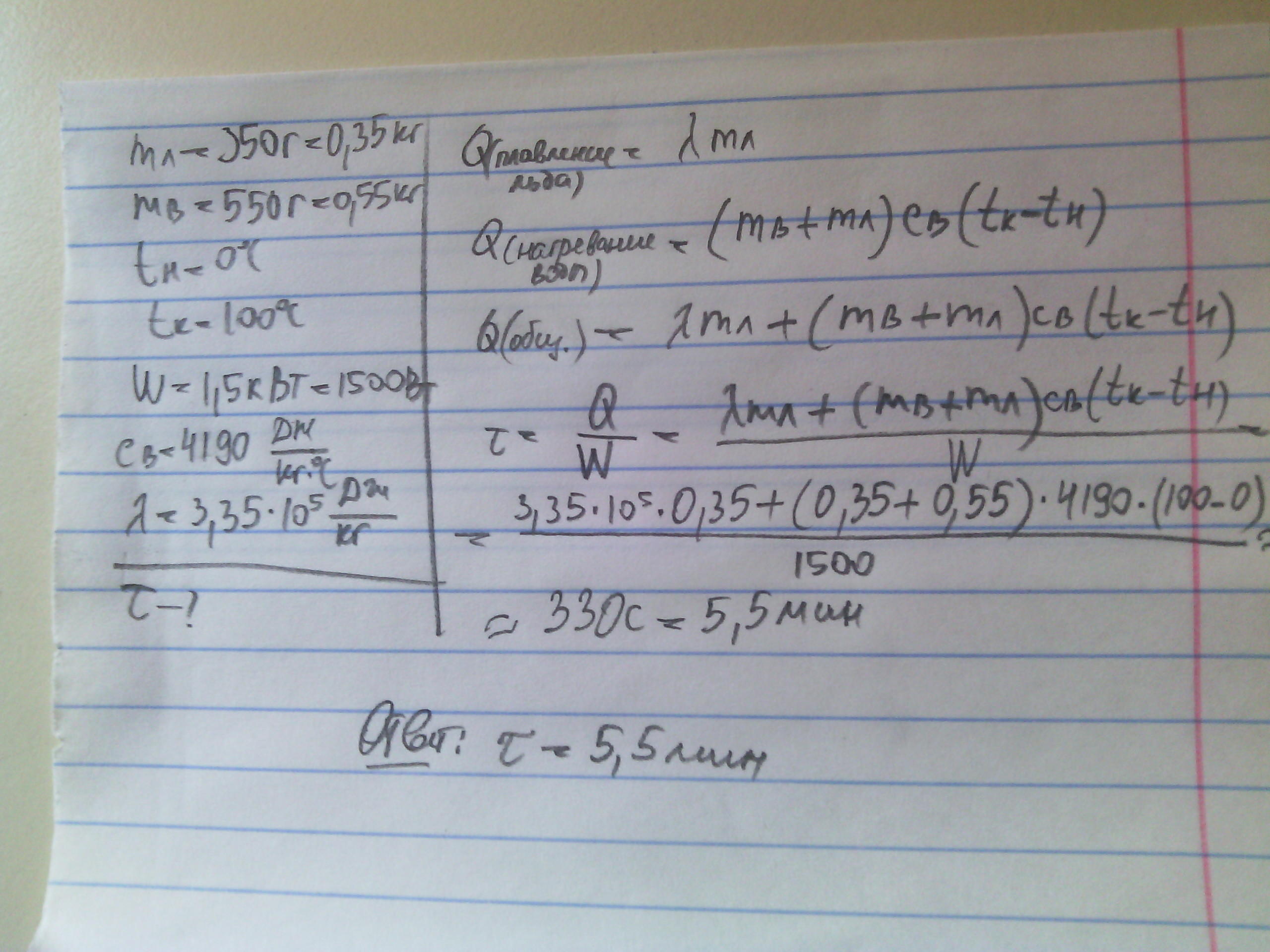Тонкостенный сосуд содержит смесь льда и воды, находящуюся при температуре 0 °С. Масса льда 350 г, а масса воды 550 г. Сосуд начинают нагревать на горелке мощностью 1,5 кВт. Сколько времени понадобится, чтобы довести содержимое сосуда до кипения? Потерями теплоты и удельной теплоёмкостью сосуда, а также испарением воды можно пренебречь. ПОМОГИТЕ ОЧЕНЬ СРОЧНО С ПОДРОБНЫМ РЕШЕНИЕМ.