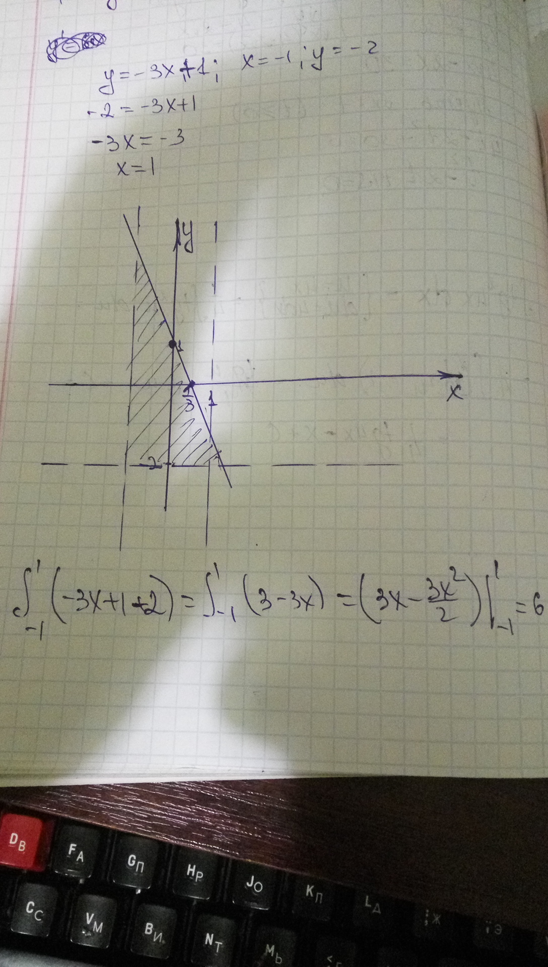 Помогите пожалуйста с графиком и решением.Вычислите площадь фигуры, ограниченной линиями:y=-3x+1,x=-1,y=-2