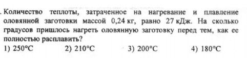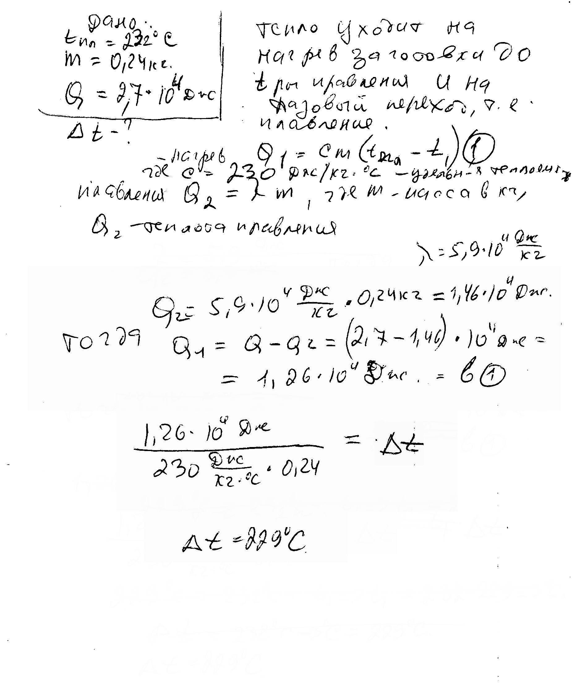 Количество теплоты, затраченное на нагревание и плавление оловянной заготовки массой 0,24кг, равно 27кДж.На сколько градусов пришлось нагреть заготовку