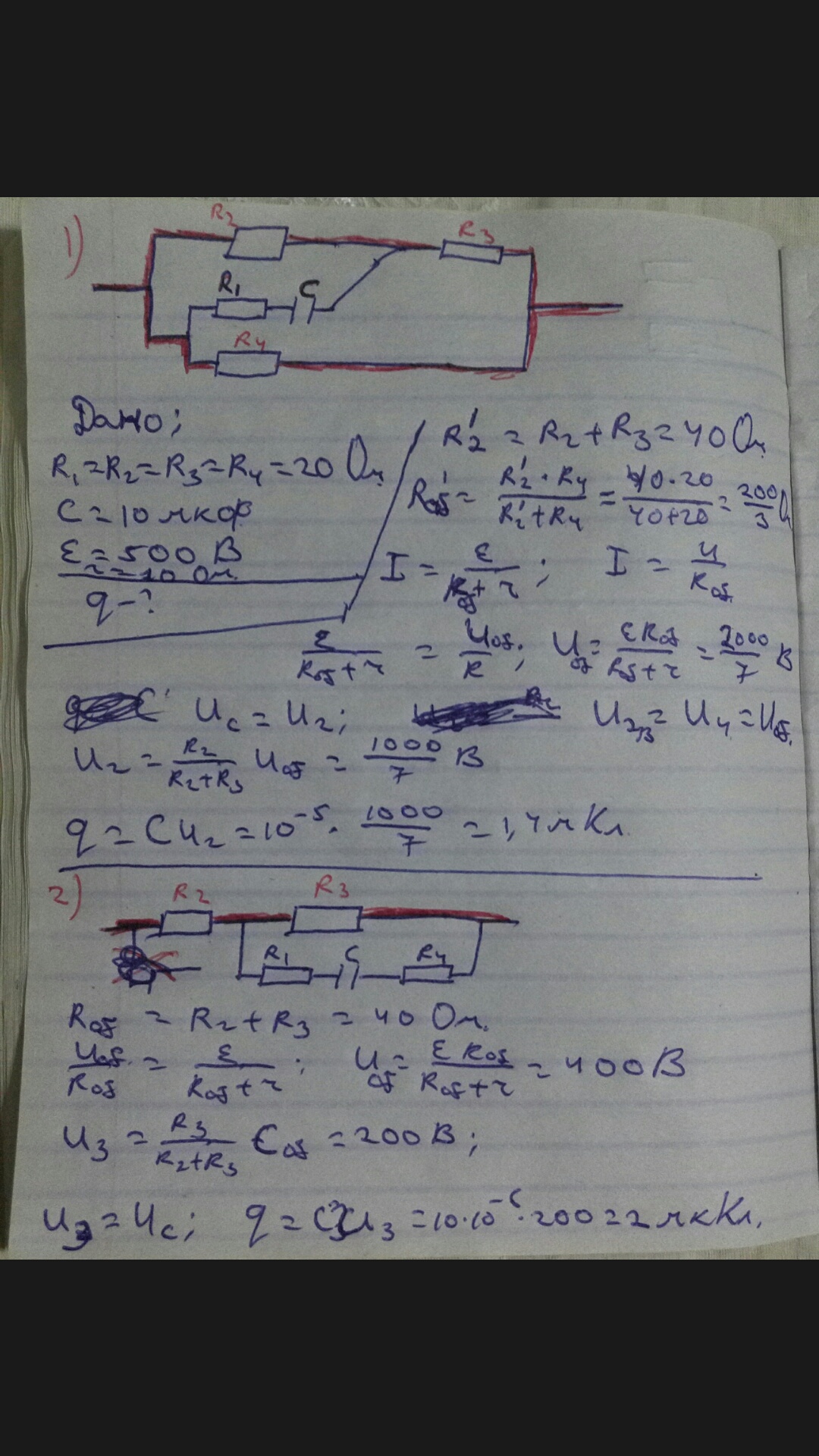 В электрической схеме, представленной на рисунке, R1 = R2 = R3 = R4 = 20 Ом, ЭДС источника тока ξ = 500 В, его внутреннее сопротивление r = 10 Ом. Если ёмкость конденсатора С = 10 мкФ, то заряд на конденсаторе при замкнутом и разомкнутом ключе равен: