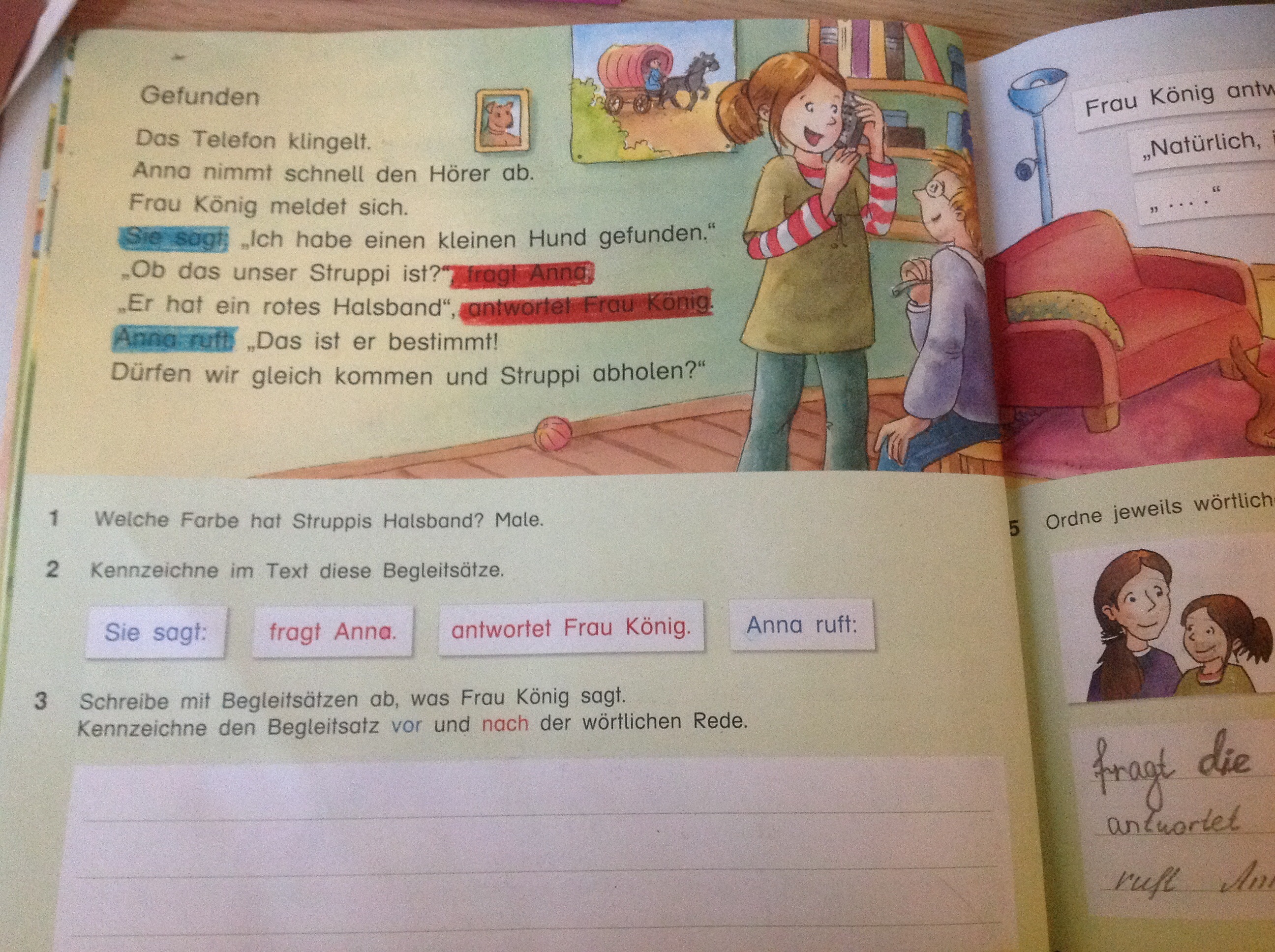 А третье задание такое: Перепиши с "авторской речью" что говорит Frau König. Покажи, где слова автора стоят до прямой речи, а где после.