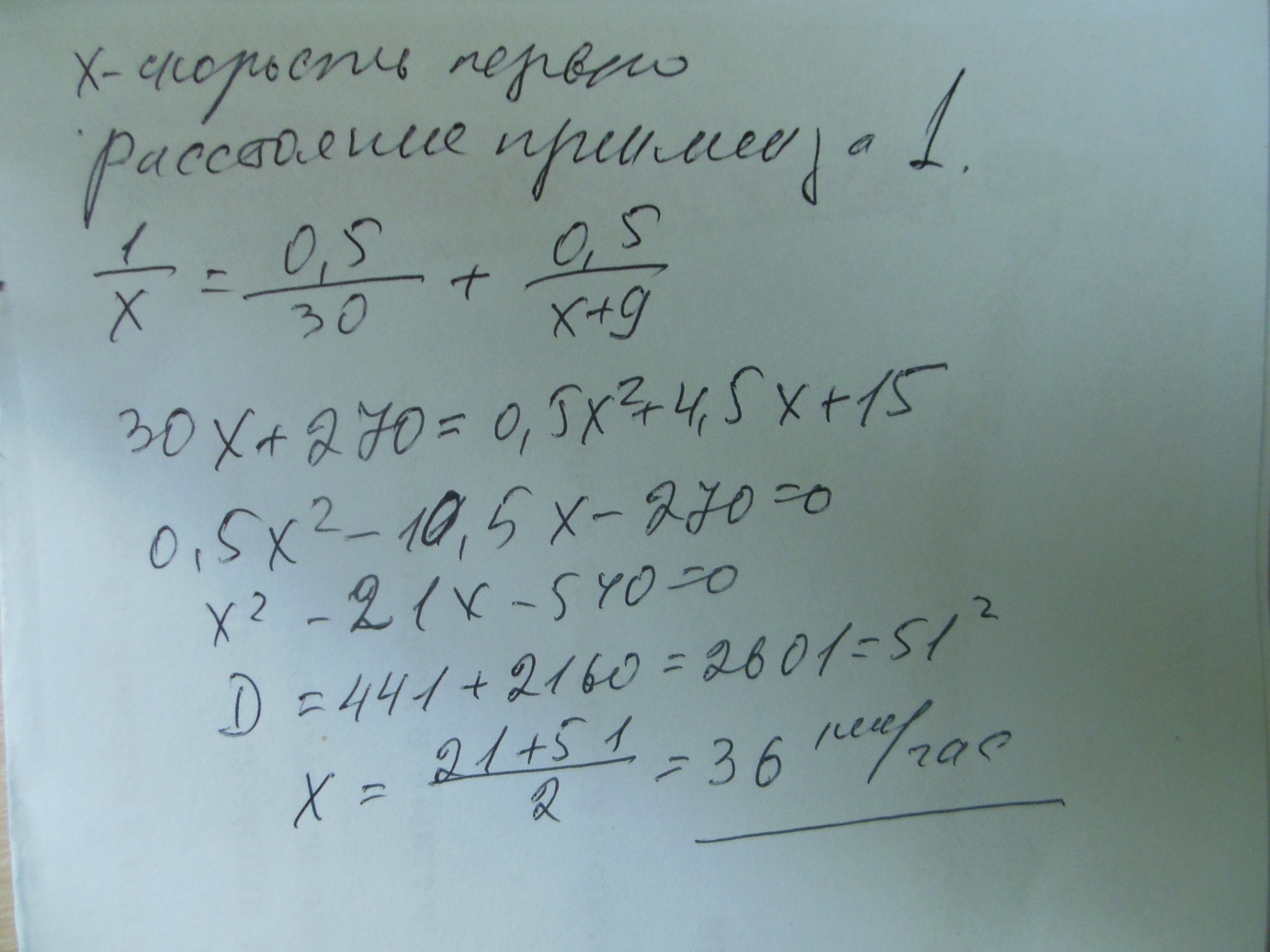 Из А в В одновременно выехали два автомобилиста. Первый проехал с постоянной скоростью весь путь. Второй проехал первую половину пути со скоростью 30 км/ч, а вторую половину пути проехал со скоростью на 9 км/ч больше скорости первого, в результате чего прибыл в В одновременно с первым автомобилистом. Найдите скорость первого автомобилиста.