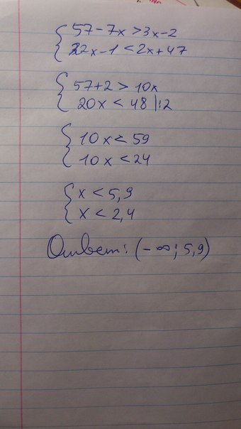 первое неравенство равно x < 5,9 ,второе x<2,4 значит ответ : х принадлежит ( 2,4 ; 5,9)