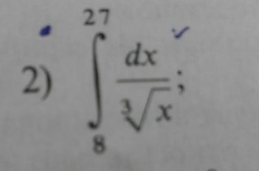 = S _{8}  ^{27} ( x^{- frac{1}{3} } )dx= frac{ x^{- frac{1}{3}+1 } }{- frac{1}{3}+1 } | _{8}  ^{27} = frac{ x^{ frac{2}{3} } }{ frac{2}{3} } | _{8}  ^{27} = frac{3}{2}* sqrt[3]{ x^{2} }  | _{8}  ^{27} = frac{3}{2} *( sqrt[3]{ 27^{2} } - sqrt[3]{ 8^{2} } )